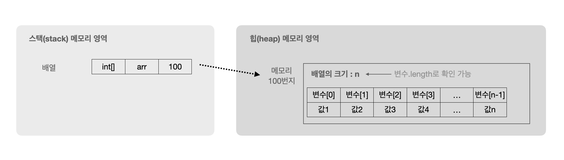 - 배열이란 동일한 자료형을 묶어 저장하는 참조 자료형입니다.