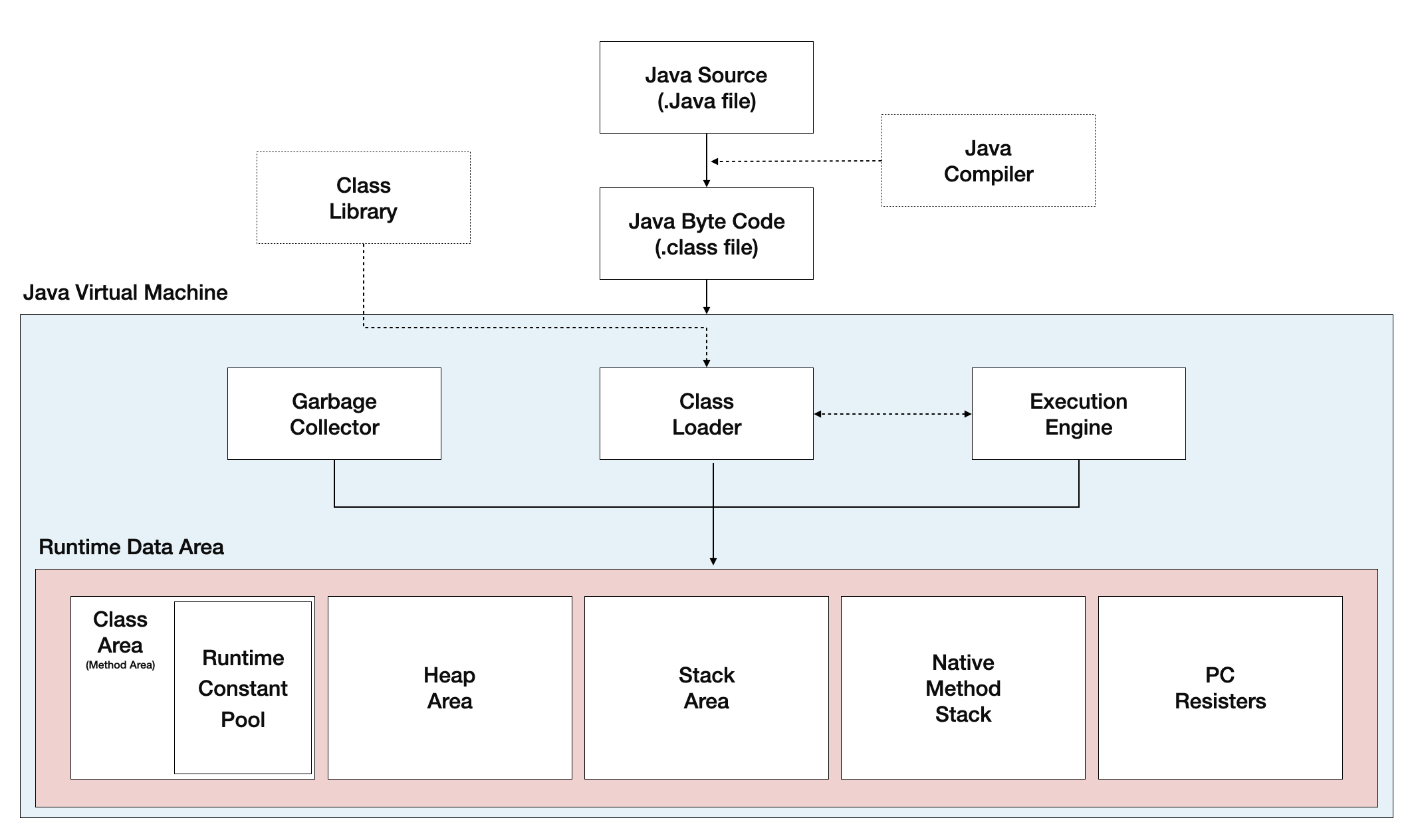 - 클래스 영역 / 힙 영역 / 스택 영역 / 네이티브 메서드 영역 / PC 레지스터 영역