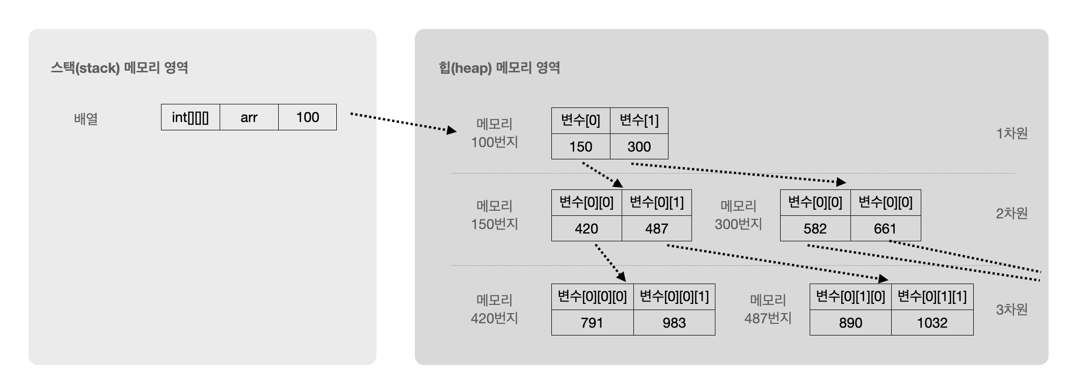 - 배열 내부에 대입된 배열이 많아질수록 배열의 차원이 증가하여 n차원 배열으라고 부릅니다.