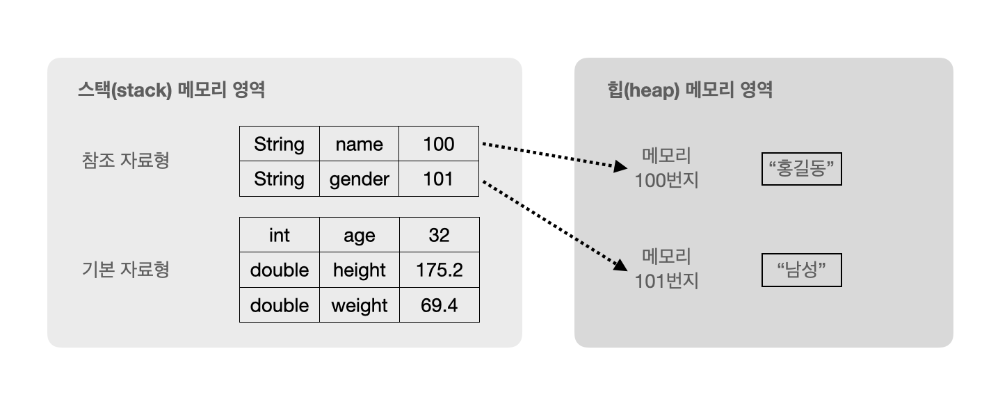 - 기본 타입으로 선언된 변수는 값 자체를 저장하지만, 참조 타입으로 선언된 변수는 객체가 생성된 메모리의 주소를 저장합니다.